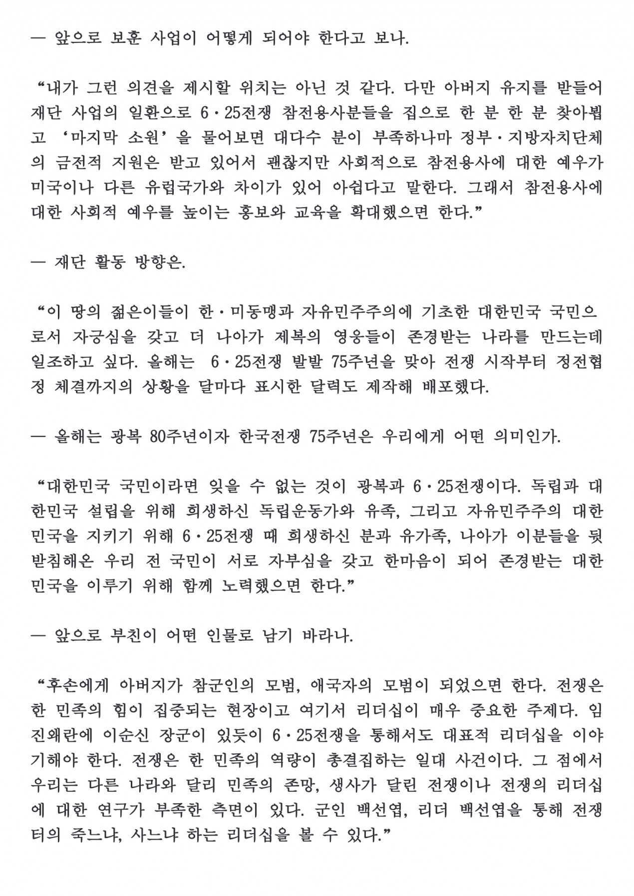"아버지 백선엽, 부하와 하나되는 리더십이 전장 승리 이끌었다"(2025.3.26. 세계일보에 게재) 페이지 정보 작성자 최고관리자 댓글 0건 조회 176회 작성일 25-03-26 11:26 목록 본문 2025년 3월 26일(수) 세계일보에, 백남희 명예이사장님께서 인터뷰한 내용이 게재되었습니다. 이전글'안보스펙트럼 19호'에 게재되었던 장순휘 박사의 '백선엽 장군를 향한 박경석의 궤변과 그 논박' 25.06.25 다음글6.25전쟁 주요 과정 상세히 담은 2025년 달력(2024.11.21. 국방일보에 게재) 24.11.22 댓글 0 댓글목록 등록된 댓글이 없습니다.