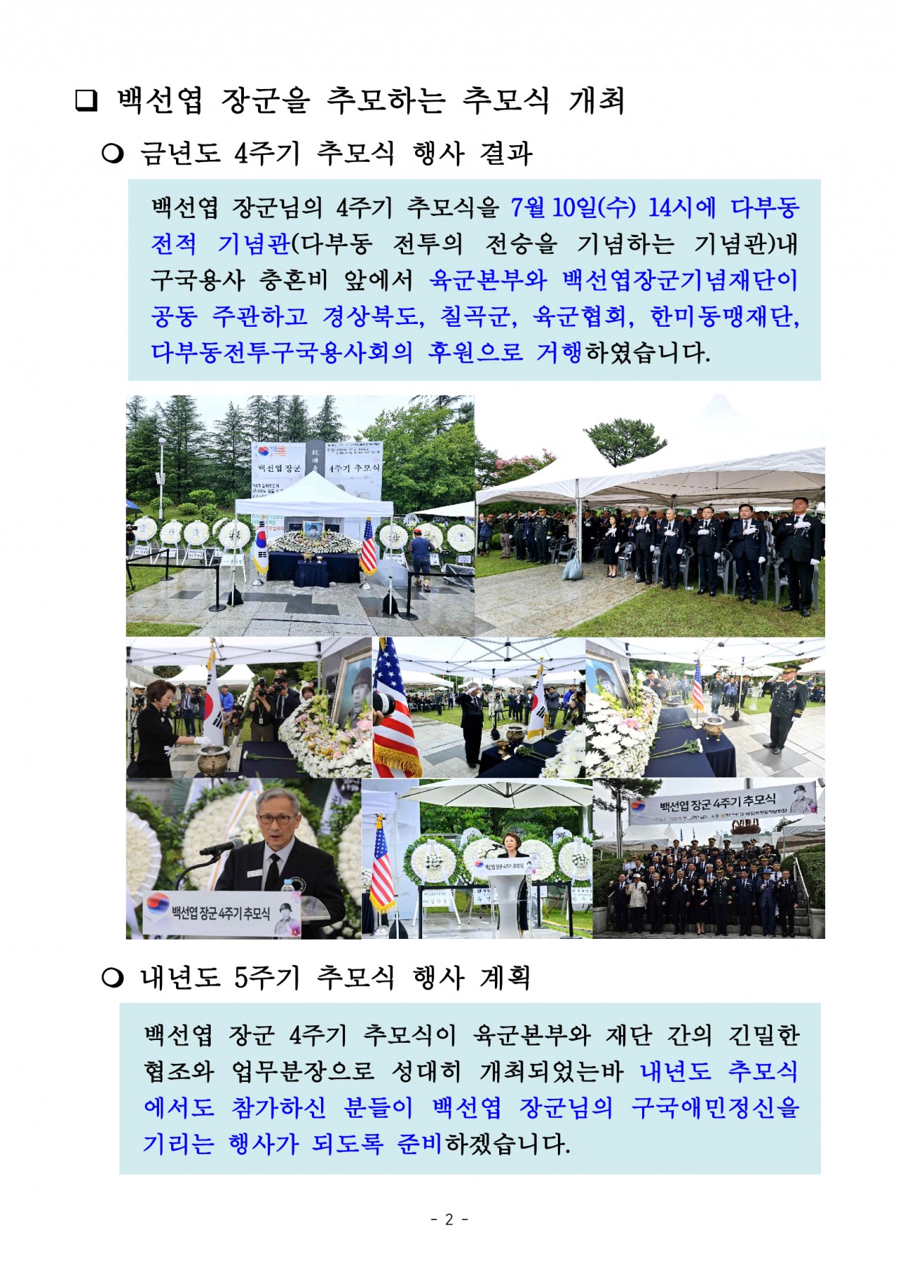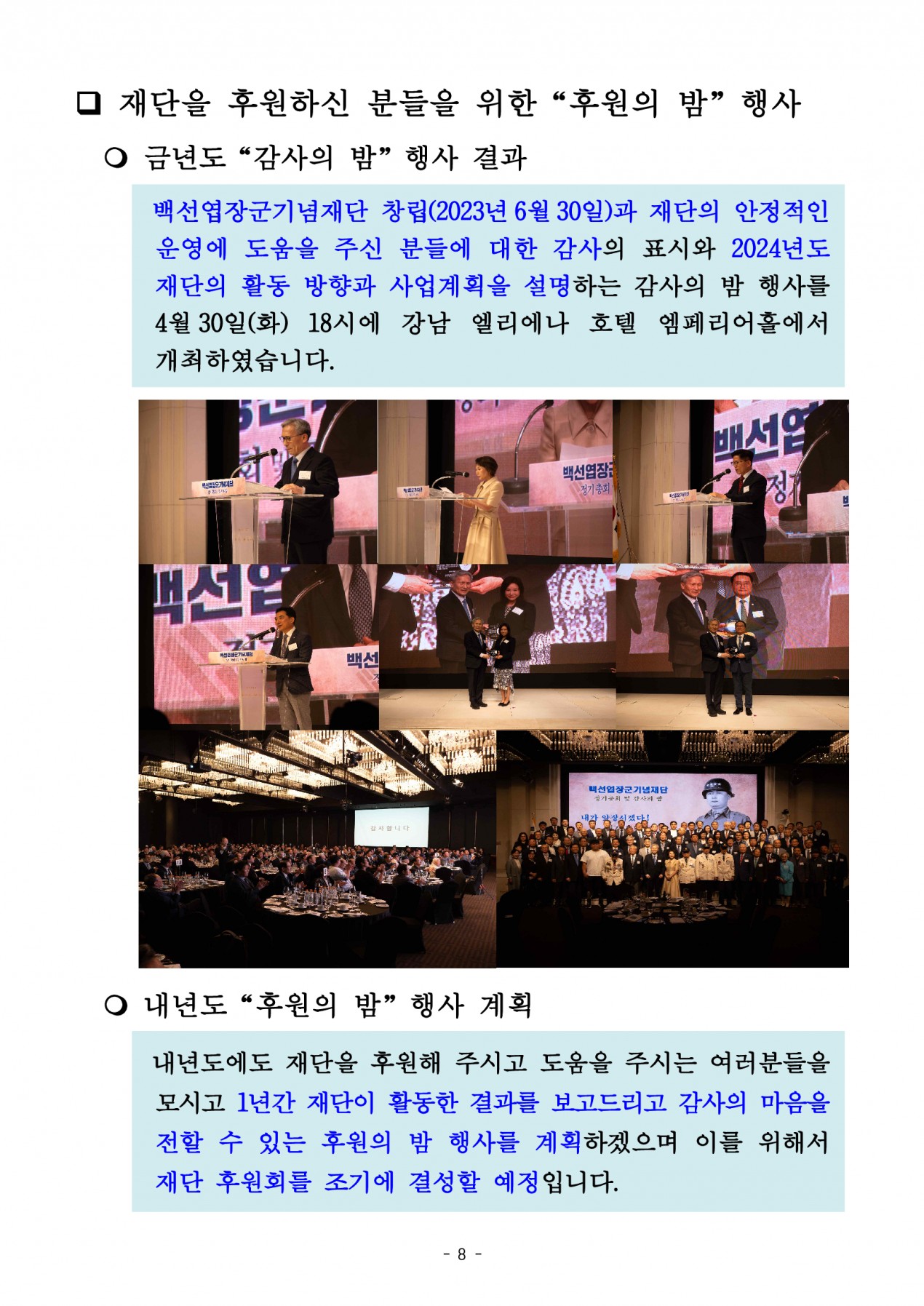 재단의 2024년도 사업추진 결과 및 2025년도 사업추진 방향을 보고드립니다.(2024.12.13) 페이지 정보 작성자 최고관리자 댓글 0건 조회 224회 작성일 24-12-19 12:00 목록 본문 그동안 백선엽장군기념재단을 후원해 주시고 격려해 주신 여러분께 깊은 감사의 말씀을 드립니다.재단은 2023년 6월 30일 창립하여 백선엽 장군의 정신을 사회에 전파하고자 여러가지 사업을 계획하였으며,금년도 한해 동안 여러분의 많은 성원으로 재단에서 계획한 사업이 잘 추진되었습니다. 이를 바탕으로 내년도에도 재단에서는 계획된 모든 사업이 성과를 거둘 수 있도록 노력하겠습니다.재단에서 추진한 2024년도 사업추진 결과 및 2025년도 사업추진 방향을 보고드립니다. 이전글2024년도 백선엽장군기념재단 공익법인 결산 서류 등의 공시 25.04.03 다음글2023년도 백선엽장군기념재단 공익법인 결산 서류 등의 공시 24.09.13 댓글 0 댓글목록 등록된 댓글이 없습니다.