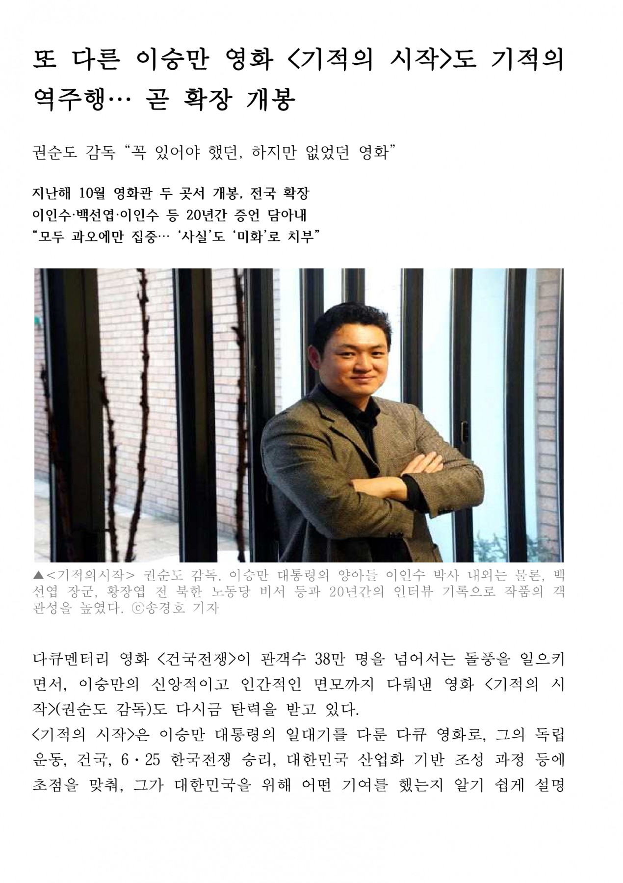 또 다른 이승만 영화 "기적의 시작"도 기적의 역주행... 곧 확장 개봉(2024.2.15, 크리스천투데이) 페이지 정보 작성자 최고관리자 댓글 0건 조회 385회 작성일 24-02-16 10:22 목록 본문 이전글반세기 만에 "대장 아버지" 백선엽 장군 찾은 그들(2009.5.2, 조선일보) 24.02.19 다음글이승만의 삶 재조명... "건국전쟁" 24만 돌파(2024.2.13, 조선일보) 24.02.16 댓글 0 댓글목록 등록된 댓글이 없습니다.
