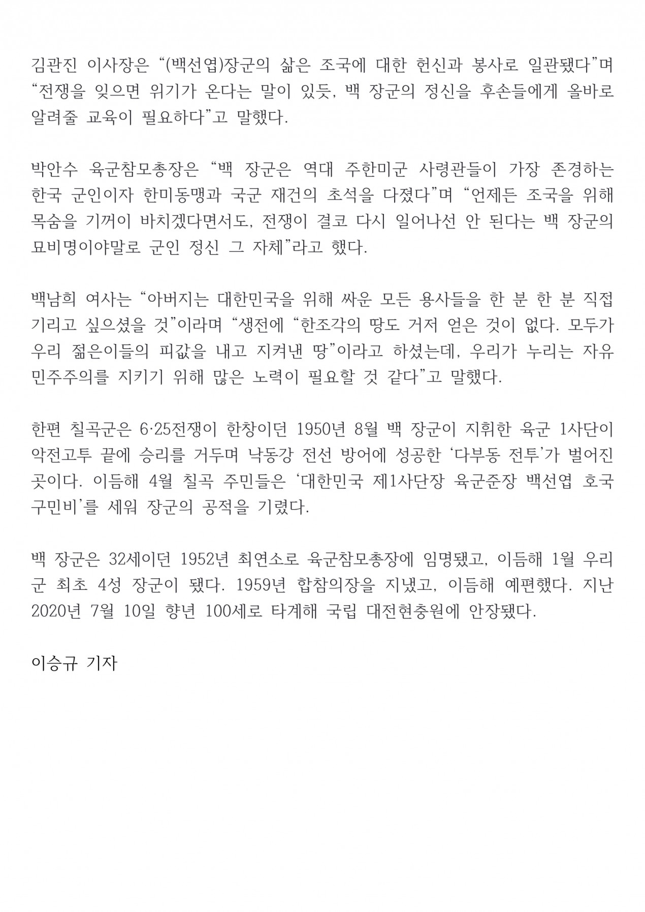 '칠곡 다부동에서 백선엽 장군 4주기 추모식 거행' 관련 뉴스가 24개 매체에서 보도되었습니다(2024.7.10, 파이낸셜뉴스…